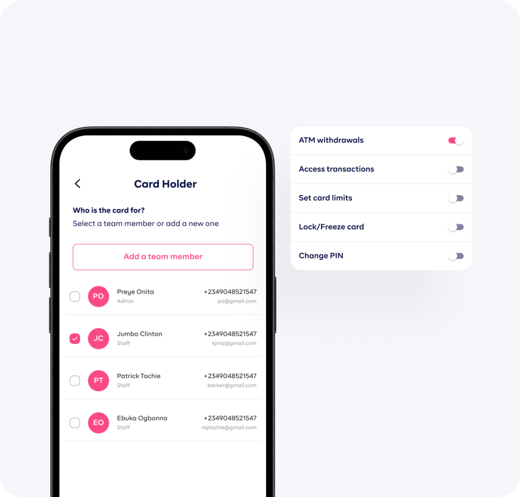 Easily add or remove team members from your expense card program. Manage who has access and control spending effortlessly.